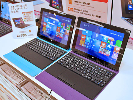 端末は、CPUにインテルAtom Z3735Fクアッドコアプロセッサ(1.33GHz)を採用し、10.1インチのマルチタッチ液晶、2GBのメモリ、64GBのSSDを搭載。OSはWindows 8.1 With Bing 32ビットで、Microsoft Office Home and Business 2013が付属する。「IIJmio ウェルカムパック for イオン」は、LTE回線が使えて最大通信速度は下り75Mbps。1か月の通信容量が2GBを超えると、通信速度に制限がかかる。ただし契約月から2年間は、特典で月間3GBまでLTE通信を利用することができる。