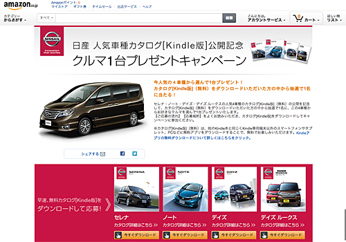 提供を記念して、「日産 人気車種カタログ[Kindle版]公開記念クルマ1台プレゼントキャンペーン」を実施。「セレナ」「ノート」「デイズ」「デイズ ルークス」のカタログをダウンロードして、キャンペーンに応募した人のなかから抽選で1名に、これらの4車種のなかから好きな車種1台をプレゼントする。期間は、2015年1月19日17時まで。
