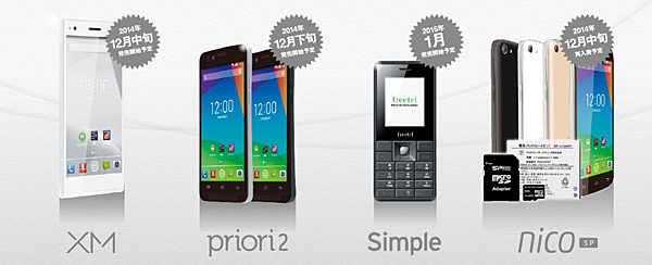 プラスワン・マーケティングは、SIMフリーブランド「freetel」の冬モデルとして、高性能・低価格スマートフォン「priori2」を12月下旬に、従来型携帯電話「Simple」を2015年1月下旬に、またLTEスマートフォン「freetel LTE XM」のホワイトモデルと3GデュアルSIMスマートフォン「freetel nico」のスペシャルパックを12月中旬に発売する。