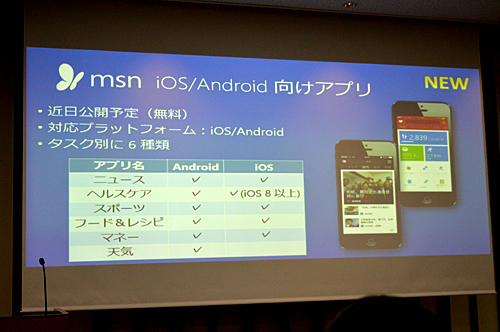 今年9月、ユーザーインターフェースをPCやスマートフォン、タブレット端末など、それぞれのデバイスに最適化したポータルサイト「msn」からは、「ニュース」「ヘルスケア」「スポーツ」「フード&レシピ」「マネー」「天気」の6種類の新アプリを発表。近く公開する予定で、対応OSはiOSとAndroid(「天気」はiOS非対応)。