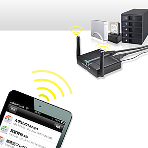 「USB HDD活かしてCloud」を介して、USB HDDやUSBメモリなどのUSBストレージを無線LANルータに接続することで、スマートフォンやタブレット端末、PCなど最大5台のデバイスから、USBストレージ内のデータにアクセスできる。LAN環境がなくても、「USB HDD活かしてCloud」をUSBストレージに接続することで、Wi-Fiでデータに直接アクセスすることができる。