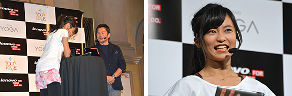続いて、特別ゲストとしてタレントの小島瑠璃子さんが登場。10月17日発売の「YOGA Tablet 2」を愛用しているという小島さんは「自立するので、キッチンでレシピを見ながら料理ができるので便利です。寝るときはうつぶせになって、ヒジをついて動画を見ています」と「YOGA Tablet 2」の使い方を紹介した。