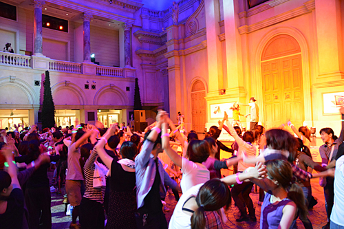 YOGA RAVEは、1時間ごとに3セッションを開催。参加者は、アップテンポな曲に合わせて、初対面の人と手を取り合って楽しそうに踊っていた。