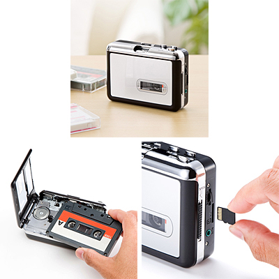 カセットテープの音源をMP3に変換し、直接microSDに保存する変換プレーヤー。カセットテープに録音されている音源をデジタルデータ化して、半永久保存することができる。MP3データなので、スマートフォンやMP3プレーヤー、PCなどで聴くことができる。また、デジタル変換することでカセットテープが不要になり、保管場所がいらない。