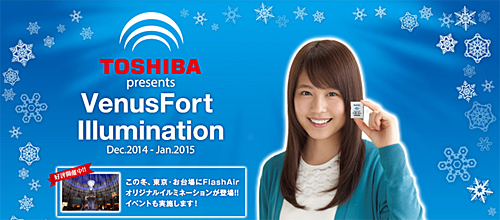 東芝は、東京・お台場のヴィーナスフォートで無線LAN搭載SDHCメモリカード「FlashAir」のイルミネーションショー「東芝FlashAir×SNOW WISH2014」を開催するなど、年末年始に向けたさまざまなキャンペーン・プロモーションを実施する。