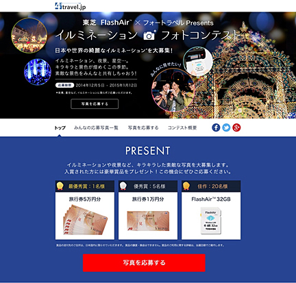 このほか、旅行のクチコミと比較サイト「フォートラベル」とタイアップして、世界中のイルミネーションや夜景など、キラキラした写真をテーマにしたフォトコンテスト「東芝FlashAir×フォートラベル presents イルミネーション・フォトコンテスト」を2015年1月12日まで実施する。応募は、フォートラベル内のフォトコンテストページから受け付ける。最優秀賞1名にJTB旅行券5万円分、優秀賞5名にJTB旅行券1万円分、佳作20名に「FlashAir」32GBモデルをプレゼントする。