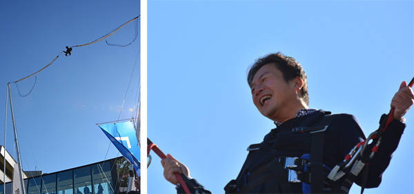 上島竜兵さんを飛ばせまいと、真剣にアイテムを選んだものの、結果は失敗に終わり、上島さんの逆バンジージャンプが決定してしまった。イベントに集まった観衆とともにカウントダウンから「バンジー!」とのかけ声とともに上島さんは青空高く飛び上がった。