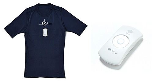 「C3fit IN-pulse」「男性用ハーフスリーブシャツ」(左)と「hitoeトランスミッター 01」