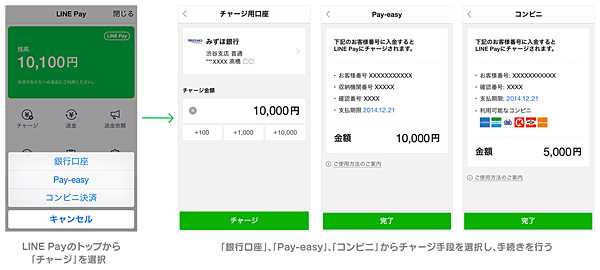 銀行口座振替は、みずほ銀行と三井住友銀行のネット口座振替サービスと連携。「LINE Pay」で銀行口座振替の登録をすることで、いつでもどこでもチャージから送金・決済ができる。