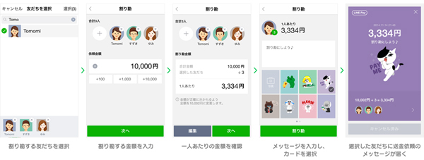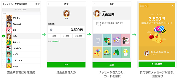 送金は、LINEでつながっていれば、相手の銀行口座を知らなくても簡単にお金を送ることができる。「LINE Pay」上から、送金する相手を選択し、支払金額とメッセージを入力するだけで、相手の「LINE Pay」口座に支払金額が入金される。手数料は無料。また、LINEの「トーク」機能を通じて特定の相手に支払いを要請する「送金依頼」機能や、合計の支払額とLINE友だちのなかから参加メンバーを選ぶだけで、均等に割った金額を各メンバーに請求できる「割り勘」機能などを備える。