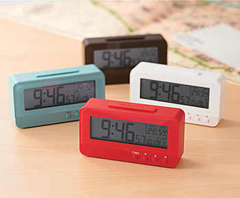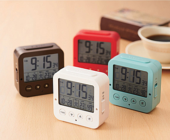 サイズは、電波式の「CLK-DD001シリーズ」が幅83×奥行33×高さ84mmで、重さは約116g。スタンダードの「CLK-DN001シリーズ」が幅105×奥行30×高さ55mmで、重さは100g。電源は、「CLK-DD001シリーズ」が単3形乾電池または単3形ニッケル水素2次電池2本、「CLK-DN001シリーズ」が単4形乾電池または単4形ニッケル水素2次電池2本。カラーは、それぞれ、ブラウン、ブルー、レッド、ホワイトの4色。税別価格は、「CLK-DD001シリーズ」が4770円、「CLK-DN001シリーズ」が3880円。