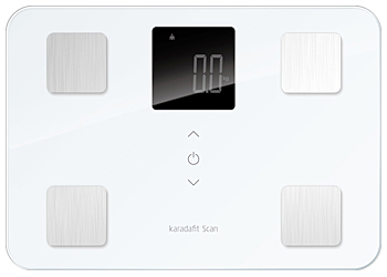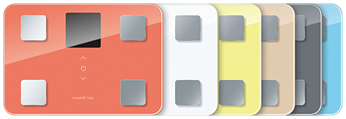 活動量計「karadafit」、心拍計「karadafit Heart」に続く「karadafit」シリーズ第三弾。体重、体脂肪率、体水分率、体筋肉率、骨量、基礎代謝、BMI値の7項目の数値を計測する体重体組成計で、Bluetooth通信機能を使って、計測したデータを自動で専用の健康管理アプリ「カラダフィット」に記録する。