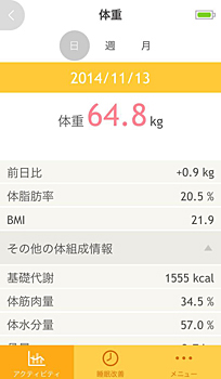 体重の測定結果をグラフ化し、前日の体重との差を比率で表したり、1か月の増減や推移を一目で確認できるなど、レコーディングダイエットにも活用することができる。また、「karadafit」で計測した1日の総消費カロリー・歩数・睡眠量などのデータと「karadafit Scan」で計測したデータを、一つのアプリ内で閲覧することができる。自身の生活リズム(活動量)と現在のからだの数値(体重体組成分)を簡単に見比べてて、ダイエットや生活習慣の改善など、健康管理に役立てることができる。