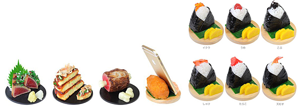 便利なだけではなく、驚きを感じてほしいという思いで開発したiPhone/スマートフォン向けの「食品サンプルシリーズ」に、新たに「カツオのたたき」「お好み焼き」「骨付き肉」「おいなりさん」「おにぎり」デザインのスマートフォンスタンドをラインアップ。思わずかぶりつきたくなる食品サンプルに、各種スマートフォンを立てることができる。縦置き・横置きに対応する。