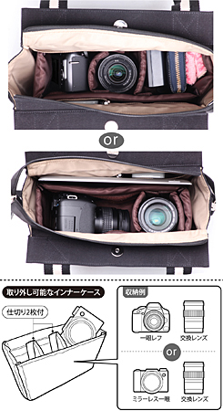 ふだん使いしやすいデザインを採用したトート型のカメラバッグ。コットン帆布を使用し、強度・耐久性・通気性にすぐれる。レンズを装着した状態のエントリクラスの一眼レフカメラと交換レンズが収納できる。