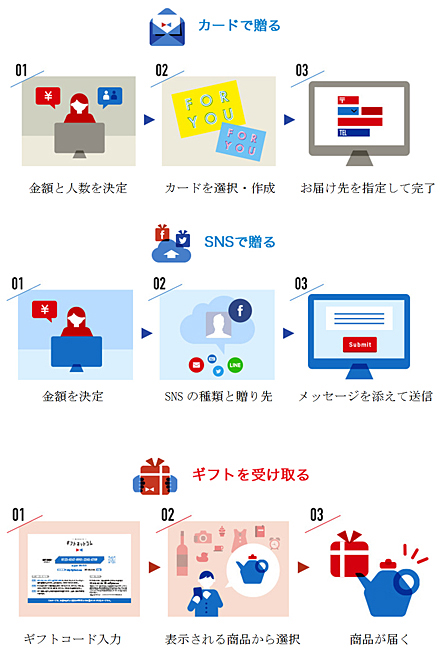 カタログギフトに比べて荷物にならず、また金額表示があるギフトカードよりも気軽に渡すことができる。オリジナルカードには、そのそのまま使えるタイプと写真や言葉をカスタマイズできるタイプがあり、年賀状や暑中見舞いに活用できる。12月15日には、年賀状向けのデザインを追加した。
