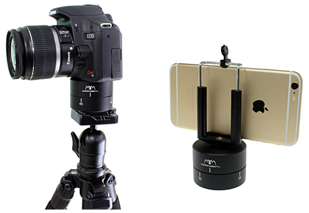 電池を使わずに360°回転するタイムラプス撮影用の回転台。一眼レフカメラやビデオカメラ、アクションカメラに接続することで、自動パノラマ撮影ができる。