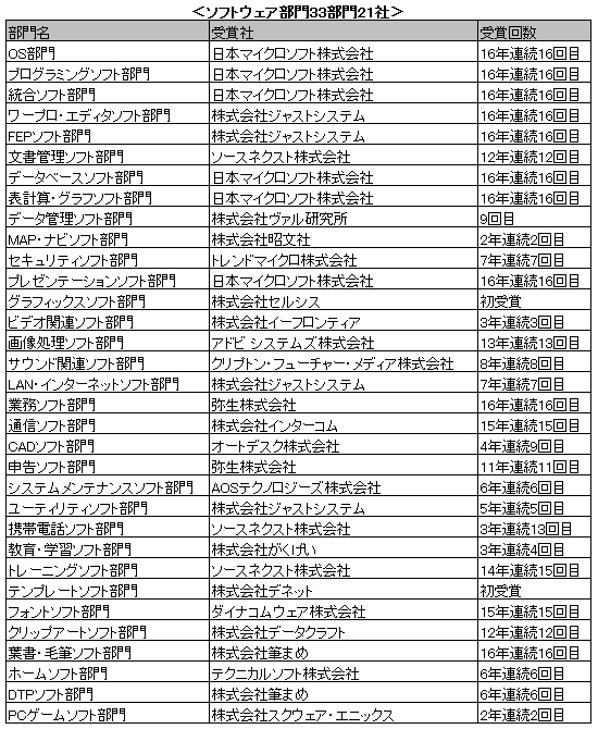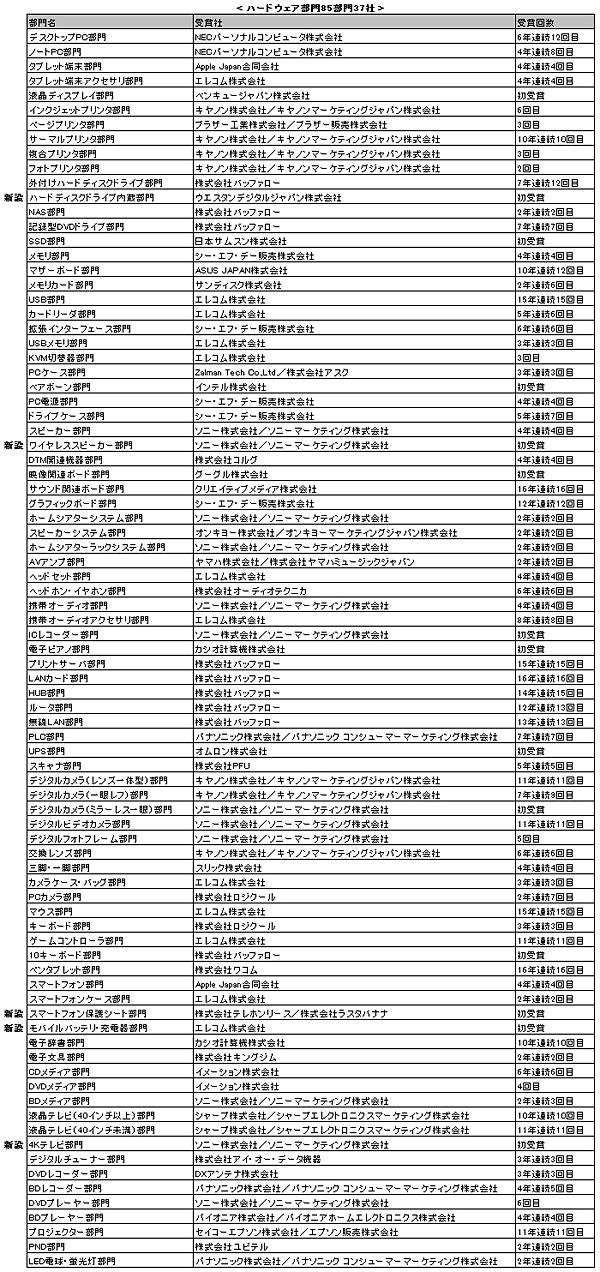 既存部門での初受賞は、ハードウェア部門では、「液晶ディスプレイ部門」のベンキュージャパン、「SSD部門」の日本サムスン、「ベアボーン部門」のインテル、「映像関連ボード部門」のグーグル、「ICレコーダー部門」「デジタルカメラ(ミラーレス一眼)部門」のソニー、「電子ピアノ部門」のカシオ計算機、「UPS部門」のオムロン、「10キーボード部門」のバッファロー。ソフトウェア部門では、「グラフィックスソフト部門」のセルシス、「テンプレートソフト部門」のデネットがそれぞれ初受賞した。