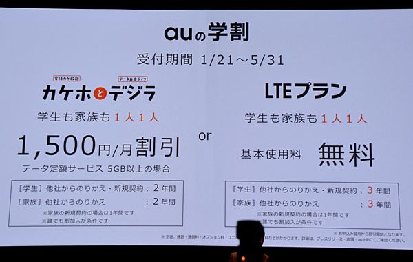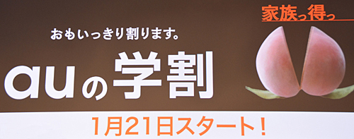 KDDIは、1月21日、MNPを含む新規契約の学生と学生の家族を対象に、au携帯電話の利用料金を割り引く「auの学割」の提供を開始した。最大で月額税別2910円を割り引く。