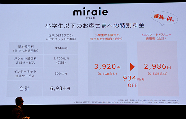 ジュニア向けプランの「ジュニアスマートフォンプラン」は、ジュニア向けスマートフォン「miraie KYL23」を購入し、利用者が小学生以下の子どもの場合に適用する。月7GBまでの「LTEフラット」プランの場合、月額税別6934円がかかるが、「ジュニアスマートフォンプラン」は、月間データ容量0.5GBを月額税別3920円で利用できる。さらに「auスマートバリュー」を適用した場合は、月額税別2986円になる。
