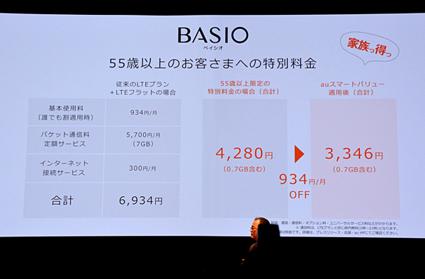 「シニアプラン」は、シニア向けスマートフォン「BASIO KYV32」「AQUOS K」を購入した55歳以上のユーザーが対象。月間データ容量は0.7GBで月額税別4280円で利用できる。「auスマートバリュー」を適用すると、月額税別3346円になる。