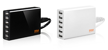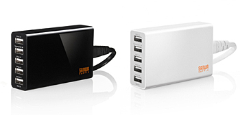 「700-AC011」は、スマートフォンやタブレット端末、USB充電機器を最大6台まで急速充電できるUSB充電器。すべてのポートが接続機器を自動的に検知し、最適な電流を送る出力自動判別機能「Smart USB System」を搭載する。