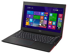 13.3型ワイド液晶(1,366×768ドット)を搭載する「LIFEBOOK UH55/T」は、タッチ非対応にすることでコストを削減。CPUには、エントリモデルのCore i3-4005Uを採用することで、高性能ながら手頃な価格を実現した。黒いボディの側面やタッチセンサ周辺に赤のラインを加え、スタイリッシュに仕上げている。