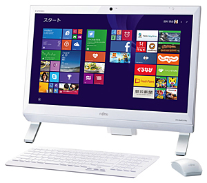 21.5型フルHD液晶を搭載する一体型PC「ESPRIMO FH52/T」は、奥行き17.5cmの省スペースモデル。ディスプレイを8~30°傾けることができるチルト構造を採用する。デスクトップPCながら、約7.1kgの軽量ボディなので、本体を移動する際も苦にならない。キーボードは本体の下にすっぽりと収納できる。