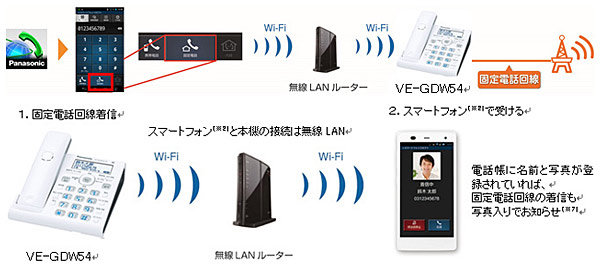 専用アプリ「スマートフォンコネクト」をインストールすることで、スマートフォンを子機にできる。固定電話回線に着信があった場合、スマートフォンで電話に出ることができ、発信時はスマートフォンの画面上で「携帯電話回線」「固定電話回線」を選ぶことができる。固定電話回線を使用して電話をかける場合でも、スマートフォンの電話帳を活用できる。また、スマートフォンの電話帳に写真データを登録していれば、着信時に写真と名前を表示する。このほか、留守番電話メッセージが録音されると、登録した4件までのメールアドレスにメール通知する。
