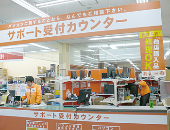 パソコンに関しては、「本体を購入することだけを目的に来店していただくのではなく、『パソコンのことなら何でも聞いてください』というスタンスで、お客様と接するようにした」。この接客によって、近くの住民が故障などのパソコントラブルが発生した際に来店するようになった。パソコンの修理はサポート受付カウンターで対応。持ち込んでもらったパソコンを引き取ってメーカーに送るという単なる窓口ではなく、お客様にきちんとトラブルの原因を説明している。「今では、パソコンの修理を当店に依頼するため、遠方からいらっしゃるお客様も多くなった」と、高橋店長は満足げだ。2014年春にはWindows XPのサポート終了に伴う駆け込み需要があったため、「Windows 7や8の問い合わせに関して、わかりやすく説明できる体制を整えた」とのことだ。また、小物ではスマートフォン関連アクセサリの販売も順調だ。ショッピングモール内に携帯電話ショップがあって、そのショップでスマートフォンの機種変更を行ってパソコン工房郡山店でUSBケーブルなどを購入するというサイクルができているようだ。