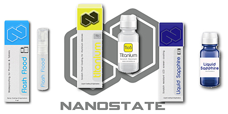 取扱いを開始したナノステイト製品は、「フラッシュフルード」「リキッドチタニウム」「リキッドサファイア」の3製品。「フラッシュフルード」は、液体による損傷や湿度などからスマートフォンを保護するナノテクノロジースプレーで、自宅で簡単に数秒間の水没などに耐える防水加工ができる。ただし、完全防水ではない。