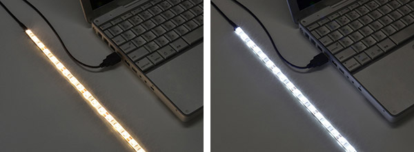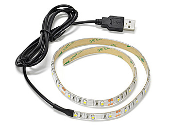 PCなどのUSB端子に接続するだけで使用できるテープ式のLEDライト。細長いテープ式で、自由に曲げることができ、カーブしている場所や狭い場所など、通常のライトが設置しにくい場所でも使用できる。