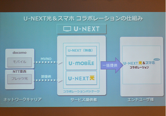 発表会で、宇野康秀社長は、「通信サービスは固定回線とモバイル回線が分かれていることが前提だったが、U-NEXTはこの二つの回線を一括提供する。双方で信頼性の高いネットワークを利用しながら、驚異的な低価格を実現した」と新サービスの特徴を説明。「ドコモのモバイル回線とNTT東日本・NTT西日本の光回線という高品質のネットワークを維持しながら、通信料を削減した。また、全国で1850万世帯が利用する光フレッツのユーザーであれば、工事不要で簡単に乗り換えることができる」と、「U-NEXT光&スマホ コラボレーション」のメリットをアピールした。
