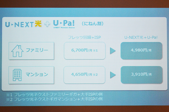 同時に提供するプロバイダサービス「U-Pa!(ユーパ)」は、ファミリータイプが月額980円で、「にねん割」を適用すると780円。マンションタイプが月額880円で、「にねん割」で730円。