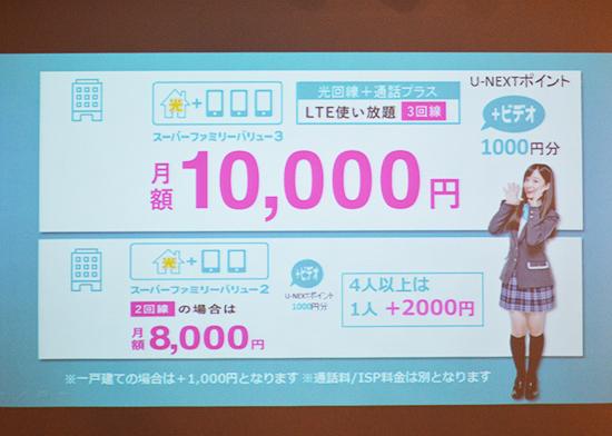 「U-NEXT光」と「U-mobile」のセットプラン「U-NEXT光&スマホ コラボレーション」は、家族で利用するとさらにお得になる「スーパーファミリーバリュー」を用意する。「U-NEXT光マンション」と「U-mobile」3回線をセットで契約すると月額1万円で、「U-mobile」2回線だと月額8000円。4回線以上からは1回線につき2000円が加算される。ただし、通信料金とプロバイダ料金は含まれない。また、スーパーファミリーバリュー契約者には、映像配信サービス「U-NEXT」で利用できるポイントを、世帯ごとに毎月1000円分プレゼントする。