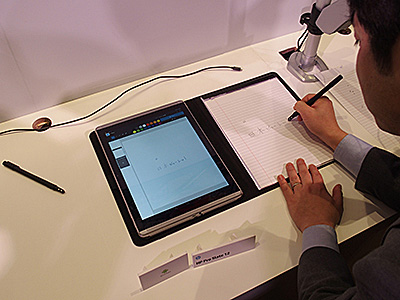 横に置いた紙に「HPデュエットペン」で文字や図形を書くとタブレット端末に電子情報として取り込むことができる「HP Pro Slate 12」