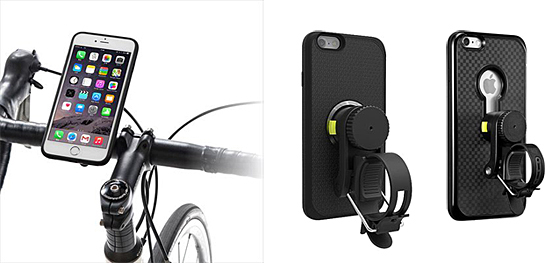 自転車のハンドルに、iPhone 6/6 Plusを取りつけるホルダー。iPhoneをナビゲーションやサイクルコンピュータとして使用したり、動画撮影をしたりしながらサイクリングできる。