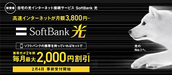 ソフトバンクBBは、NTT東日本とNTT西日本が提供する光回線サービスを使った独自サービス「SoftBank 光」の提供を3月1日に開始する。2月4日に事前受付を開始する。
