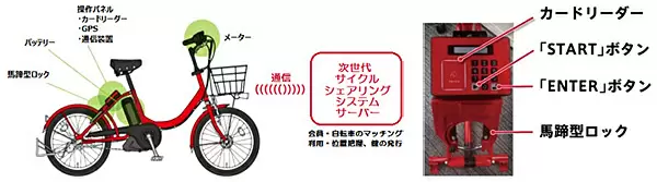 次世代サイクルシェアリングシステムは、従来のサイクルポートがもっていた通信機能やGPS機能、自転車の貸出・返却制御や電動アシスト機能のバッテリ残量の把握などの遠隔制御機能を、すべて自転車本体に搭載するシステム。サイクルポート設置に関わるコストの削減と省スペース化を図ることで、市街地でも柔軟にサイクルポートを設置できる。