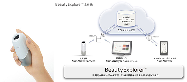 肌解析システム「BeautyExplorer」は、手のひらサイズの新開発の肌測定機「Skin View Camera」と設置場所を選ばないタブレット端末、見やすく使いやすい肌解析アプリ、開発を進めてきた肌解析技術「SSKEP(スケップ)」を応用した解析クラウドサーバーなどを組み合わせて提供。肌情報を高い精度で測定し、客観的に肌の状態を解析するとともに、高いユーザビリティをもつ肌解析システムを実現した。
