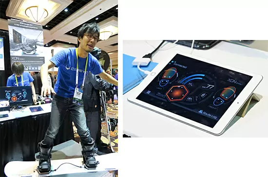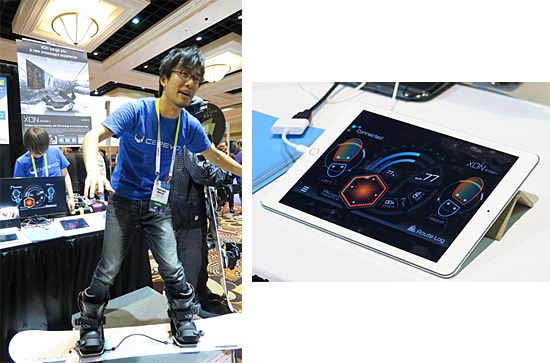 日本のベンチャー企業であるセレボは、タブレット端末と連動するスノーボード用ビンディング「XON SNOW-1」を出品。センサによって加重をリアルタイムで認識し、タブレット端末の画面上に表示する。(デジタル家電ライター/コヤマタカヒロ)