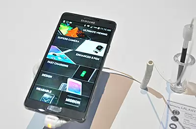 スマートフォンのグローバル市場でトップシェアを誇る韓国のサムスン。日本でも「GALAXY」シリーズは高い人気を誇る。サムスンは新作の発表こそなかったものの、日本未発売の5.7インチディスプレイを搭載した「GALAXY Note 4」を展示していた。