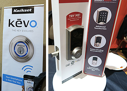 「IoT(Internet of Things)」というキーワードで多くのメーカーが手がけているのが、スマートフォンと連携するドアロックだ。アメリカを代表するドアノブメーカー、クイックセットの「kevo」はその代表。スマートフォンアプリで登録することで、いちいち鍵を取り出すことなく、タッチだけでロック/解除ができる。アプリからは、それらの履歴や、誰がいつ出入りしたかといったログを取得できる仕組みだ。