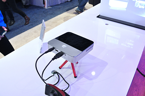 一方、OSにAndoridを搭載したモバイルプロジェクター「スマートプロジェクター Spro 2」はLTEに対応。モバイルルータとして利用でき、上部の5インチディスプレイで単体でも操作できる。また、スマートフォンとワイヤレスで接続して操作することもできる。投影できる解像度は1280×720ドットで輝度は200lm(ルーメン)と、プロジェクターとしての機能も十分だ。発売日や価格は未定。