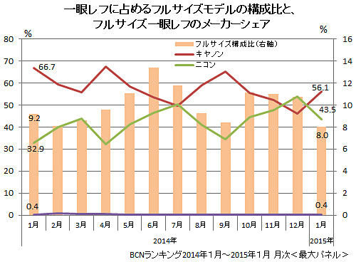 現在、フルサイズ一眼レフ市場の状況は、トップのキヤノンと2位ニコンの寡占市場。ここにリコーが割って入ることになる。一眼レフに占めるフルサイズモデルの販売台数構成比はおよそ1割前後で、この1月は8.0%だった。