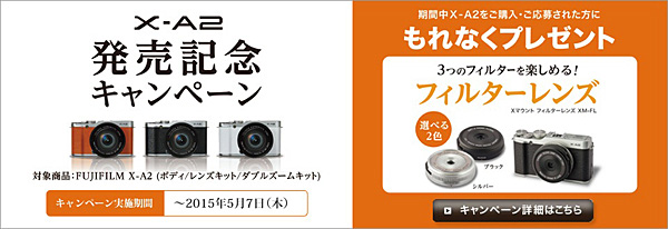 「FUJIFILM X-A2」の発売を記念して、「FUJIFILM X-A2」を購入して申し込んだ人を対象に、Xマウント専用アクセサリ「フィルターレンズ(XM-FL)」をもれなくプレゼントする「X-A2発売記念キャンペーン」を実施する。期間は発売から5月7日まで。