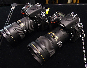 一方、ニコンは、望遠300mmでF4の明るさながら、従来製品に比べて大幅に小型化した「AF-S NIKKOR 300mm f/4E PF ED VR」が注目を浴びた。PF(位相フレネル)レンズという特殊なレンズを採用したことで、従来モデルより全長で75mmも短い147.5mm、重さも42%軽い755gと小型・軽量。プロカメラマン御用達の定番標準ズーム「AF-S NIKKOR 24-70mm f/2.8G ED」より少し大きい程度で145gも軽いとあって、レンズコーナーでは引っ張りだこだった。また、天体撮影用専用の一眼レフとして発表されたばかりで、5月下旬に発売予定の「D810A」も、実機がガラスケース内に展示されていた。