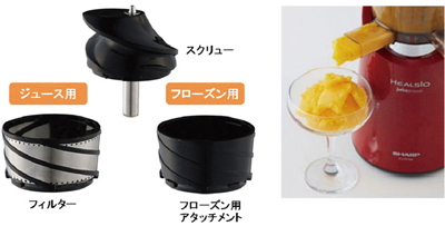 「EJ-CF10A」には、フローズン用アタッチメントが付属。フィルタをつけ替えることで、手軽に滑らかなフローズンデザートやフローズンサラダをつくることができる。オレンジやバナナなどの果物のほか、ジュースにすると苦みやえぐみを感じやすいホウレンソウやブロッコリなどの食材も、フローズンサラダにしておいしく食べることができるように「健康メニュー」を拡充した。
