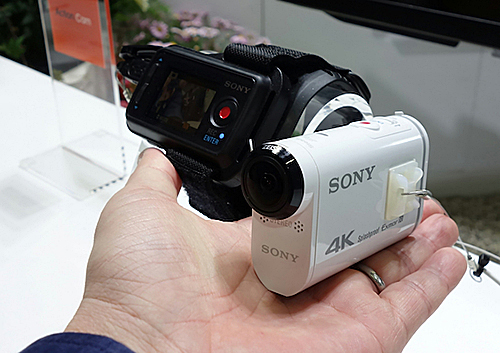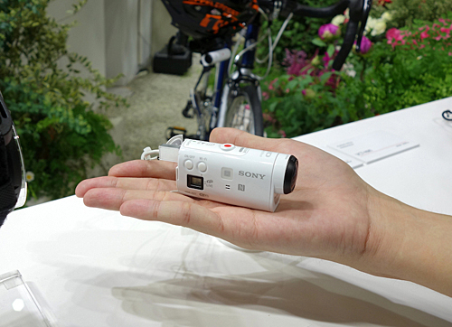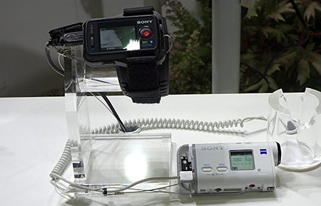 ウェアラブルカメラに力を入れるソニーは、小型・超軽量で人気のアクションカム「HDR-AZ1」のほか、参考展示として、2015 International CESで発表した「FDR-X1000V」、フルHD対応で高度な手ブレ補正や風切り音を抑える機能を搭載した「HDR-AS200V」などを展示した。