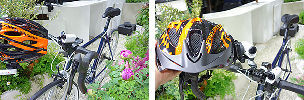自転車に装着(左)、オプションのユニバーサルヘッドマウントを使えばヘルメットにも装着できる(右)